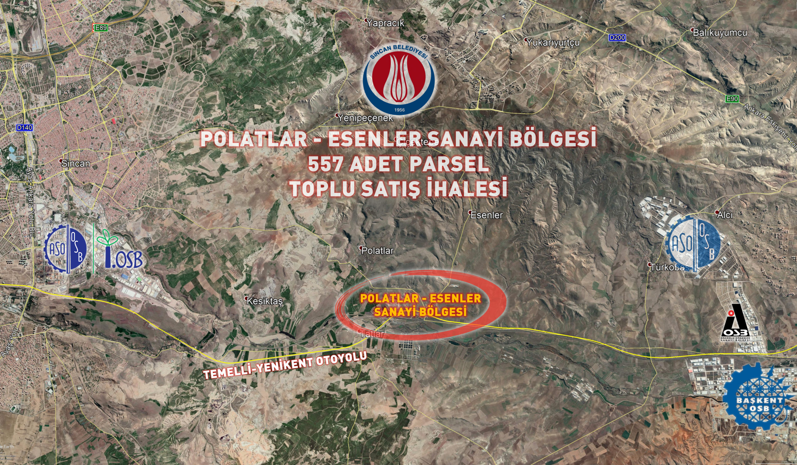 Sincan Belediyesi, Polatlar ve Esenler Mahallelerinde bulunan toplam 375.338,85 m2 yüzölçümüne sahip, imar planında Küçük Sanayi Alanı olarak belirlenmiş 557 adet parseli toplu olarak satmak için ihaleye çıktı.