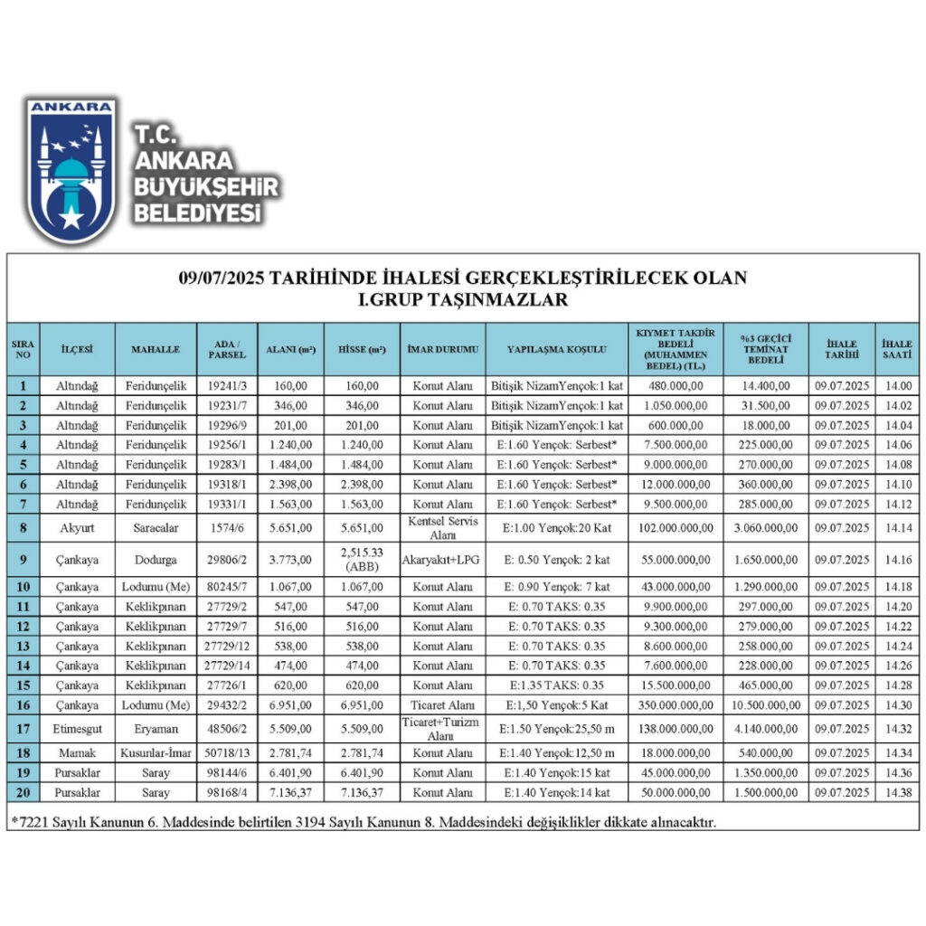 Ankara Büyükşehir Belediyesi mülkiyetinde bulunan 20 adet arsayı ihale yolu ile satışa çıkardı.